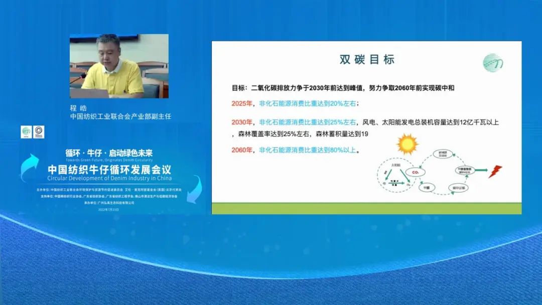 中國紡織工業聯合會產業部副主任程晧以“中國紡織行業綠色低碳發展目標”為題進行了主題分享。他表示,“雙碳”背景下,紡織行業綠色循環發展的目標,是“到2025年在行業生態文明建設和履行環境責任取得積極進展下,生產方式綠色轉型成效顯著,產業結構明顯優化,綠色低碳循環發展水平明顯提高。廢舊紡織品循環利用體系初步建立,循環利用能力大幅提升,廢舊紡織品循環利用率達到25%,2030年建成較為完善的廢舊紡織品循環利用體系,生產者和消費者意識明顯提高,廢舊紡織品循環利用率達到30%。”