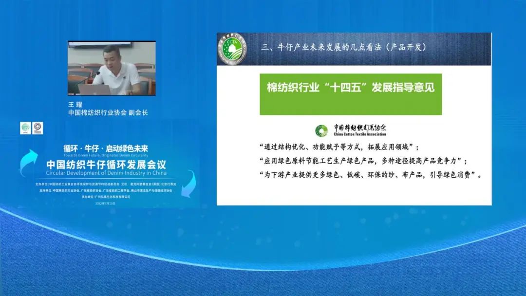 為破解資源環境約束、應對氣候變化,貫徹《“十四五”循環經濟發展規劃》、《關于加快推進廢舊紡織品循環利用的實施意見》等有關規定,構建資源循環型產業體系和廢舊物資循環利用體系,7月15日,中國紡織工業聯合會環境保護與資源節約促進委員會攜手艾倫·麥克阿瑟基金會共同主辦,以“循環•牛仔•啟動綠色未來”為主題的牛仔循環發展線上會議舉行。