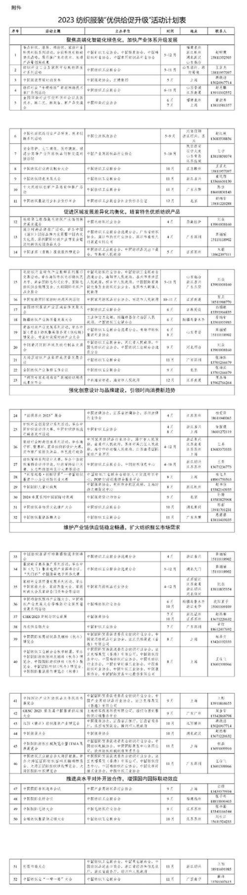 (三)注重工作實效。各單位在開展活動時,要明確目標,壓實責任,將各項活動的出發點和落腳點聚焦在紡織服裝穩增長、擴內需、穩外需上。有關行業協會要推動各項活動在信息交流、成果推廣、產業對接、國際合作等方面落實落地,同時做好總結分析工作。各地工業和信息化主管部門、商務主管部門要拿出具體舉措,組織開展具有當地產業特色的各類活動,有關情況及時報送。