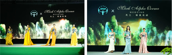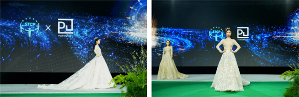 隨著現(xiàn)場(chǎng)的燈光漸暗,一場(chǎng)以“綠色纖維”為原料的成衣走秀拉開帷幕。本次大秀主要呈現(xiàn)了禮服、運(yùn)動(dòng)裝、婚紗三大品類的服裝,參與的高定和品牌有:VIVIANNEJIALIU、PJ、芮邦、馬克華菲、馬克•蝶麗奧娜。模特身著華美絢爛的色彩禮服、時(shí)尚輕便的運(yùn)動(dòng)裝以及飄逸靈動(dòng)的紗裙游走在T臺(tái)上,演繹著“綠色纖維”的時(shí)尚魅力,直觀生動(dòng)的展示了“綠色纖維”多場(chǎng)景應(yīng)用的適配性。