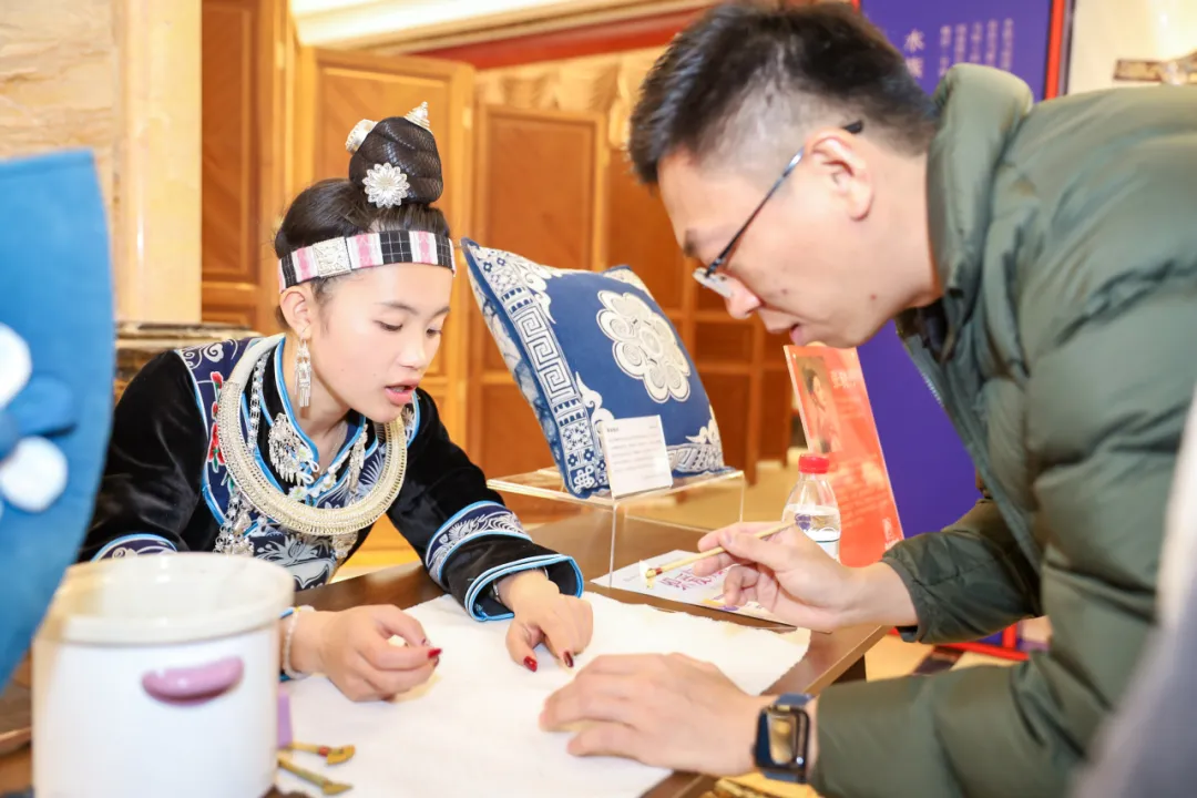 貴州省黔東南苗族侗族自治州丹寨縣的苗族蠟染技藝非遺傳承人、天才媽媽蠟染夢想工坊骨干張曉丹現場展示苗族蠟染技藝