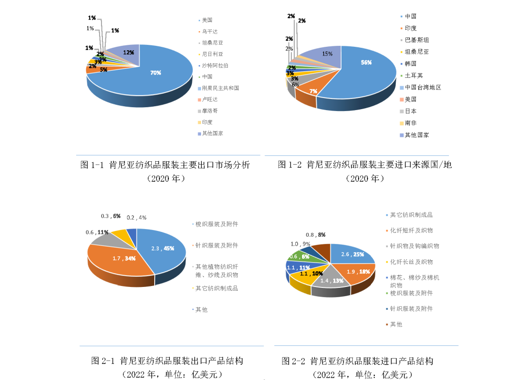 肯尼亞國家統(tǒng)計(jì)局?jǐn)?shù)據(jù)顯示,2022年肯尼亞紡織品服裝出口總額為5.1億美元,其中紡織品出口額為1.1億美元,服裝出口額達(dá)到4億美元,主要出口產(chǎn)品為梭織服裝及附件(占比45%)、針織服裝及附件(占比34%)。同期紡織品服裝進(jìn)口總額為10.4億美元,主要進(jìn)口產(chǎn)品為化纖短纖及織物(占比18%)、針織物及鉤編織物(占比13%)、化纖長絲及織物(占比10%)等。
