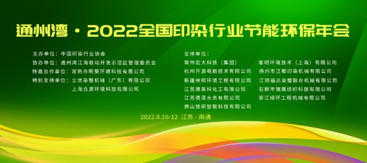 ?為加快綠色低碳技術的推廣應用,推動印染行業全面綠色轉型,實現高質量發展和高水平保護,8月11日,由中國印染行業協會主辦、通州灣江海聯動開發示范區管理委員會協辦的“通州灣?2022全國印染行業節能環保年會”在江蘇省南通市隆重舉行。