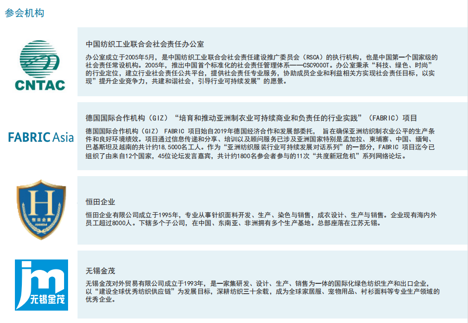 為了深入了解和探討這些問題,在德國國際合作機構(GIZ)的協助下,中國紡織工業聯合會(CNTAC)社會責任辦公室開展了涉及在緬甸、柬埔寨、越南和孟加拉的85家中資企業的調查研究,并將在本次會議發布調研報告。