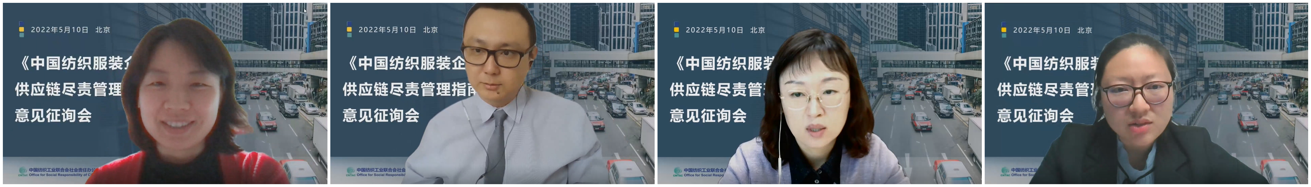 2022年5月10日下午,由中國紡織工業聯合會社會責任辦公室主辦的《中國紡織服裝企業社會與環境盡責管理指南(征求意見稿)》(暫定名,下稱“《盡責管理指南》”或“指南”)意見征詢會在線上成功舉辦。來自南開大學、北京工商大學、聯合國開發計劃署(UNDP)、聯合國兒童基金會(UNICEF)、經濟合作與發展組織(OECD)、德國國際合作機構(GIZ)等十五家機構的二十余位專家參加了本次會議,就盡責管理指南的改進與實施進行了全面、深入的討論。