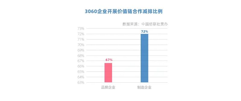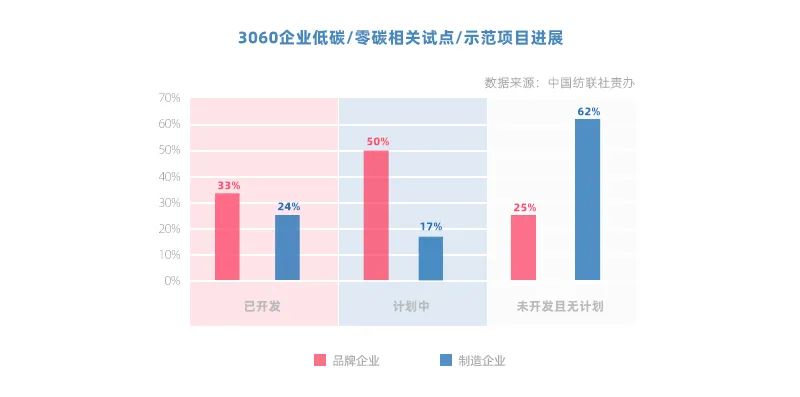 隨著國(guó)家推動(dòng)并建立綠色低碳相關(guān)工廠與產(chǎn)品等評(píng)價(jià)方法,紡織企業(yè)積極響應(yīng),錨定產(chǎn)業(yè)轉(zhuǎn)型新機(jī)遇,3060企業(yè)已有27%完成開(kāi)發(fā)低碳/零碳相關(guān)試點(diǎn)/示范項(xiàng)目。