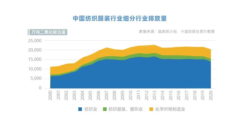 中國(guó)紡織服裝行業(yè)溫室氣體排放自2000年起隨著行業(yè)快速發(fā)展逐步上升,而后進(jìn)入平穩(wěn)期。2014年-2020年溫室氣體排放年均增速均低于0.5%。根據(jù)行業(yè)能源消費(fèi)數(shù)據(jù)計(jì)算,2020年整個(gè)行業(yè)碳排放總量約為2.09億噸。從排放來(lái)源看,中國(guó)紡織服裝行業(yè)排放主要來(lái)自上游的材料制造加工端(包括紡織業(yè)和化學(xué)纖維制造業(yè)),紡織服裝、服飾業(yè)占比低于10%。