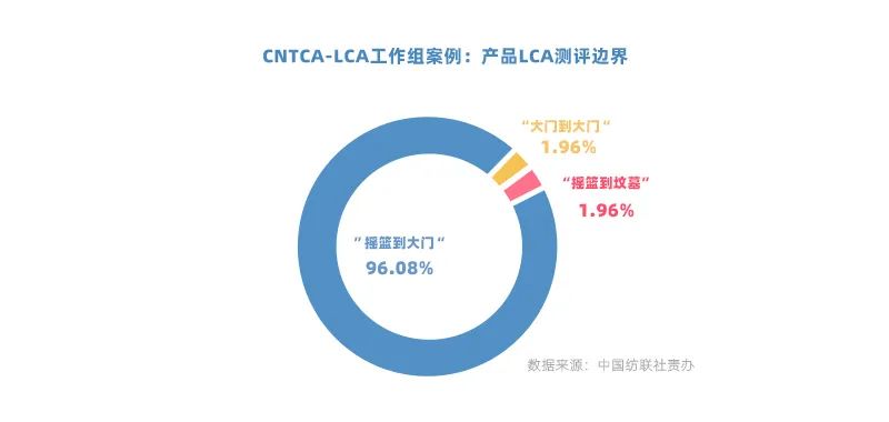 根據(jù)CNTAC-LCA工作組統(tǒng)計(jì),目前絕大部分(96.08%)產(chǎn)品的測(cè)評(píng)邊界為“搖籃到大門(mén)(Cradle-to-Gate)”,對(duì)于紡織品即從“纖維到成品”,1.96%的產(chǎn)品測(cè)評(píng)邊界為“搖籃到墳?zāi)梗–radle-to-Grave)”,1.96%的產(chǎn)品測(cè)評(píng)邊界為“大門(mén)到大門(mén)(Gate-to-Gate)”。