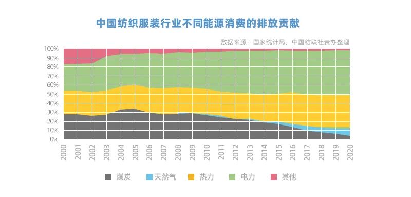 從能源結(jié)構(gòu)來(lái)看,中國(guó)紡織服裝行業(yè)不斷優(yōu)化能源結(jié)構(gòu),推進(jìn)行業(yè)能源使用的低碳轉(zhuǎn)型。中國(guó)紡織服裝行業(yè)排放絕大部分來(lái)自能源使用(主要是電力和蒸汽),到2020年,“煤改氣”“煤改電”取得顯著進(jìn)展,行業(yè)煤炭消耗占比從30%顯著下降至低于10%,電氣化程度不斷提高。