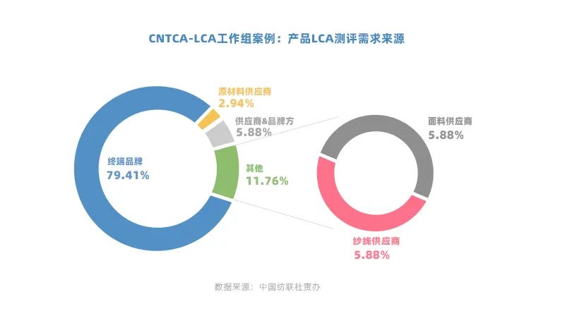 CNTAC-LCA工作組案例顯示,終端品牌是產(chǎn)品碳足跡測(cè)評(píng)的主要推動(dòng)者。79.41%的測(cè)評(píng)需求來(lái)源于品牌,2.94%來(lái)源于原材料供應(yīng)商,11.76%來(lái)源于紗線、面料等中間產(chǎn)品供應(yīng)商,還有剩余5.88%的測(cè)評(píng)由供應(yīng)商和品牌方合作發(fā)起。