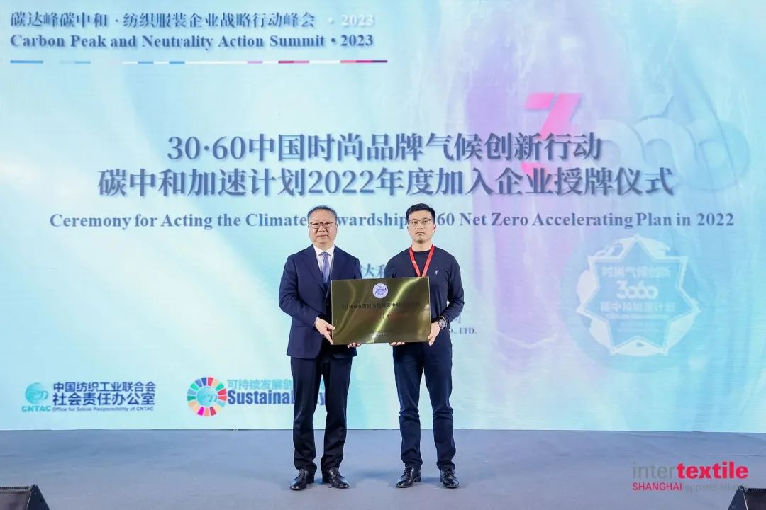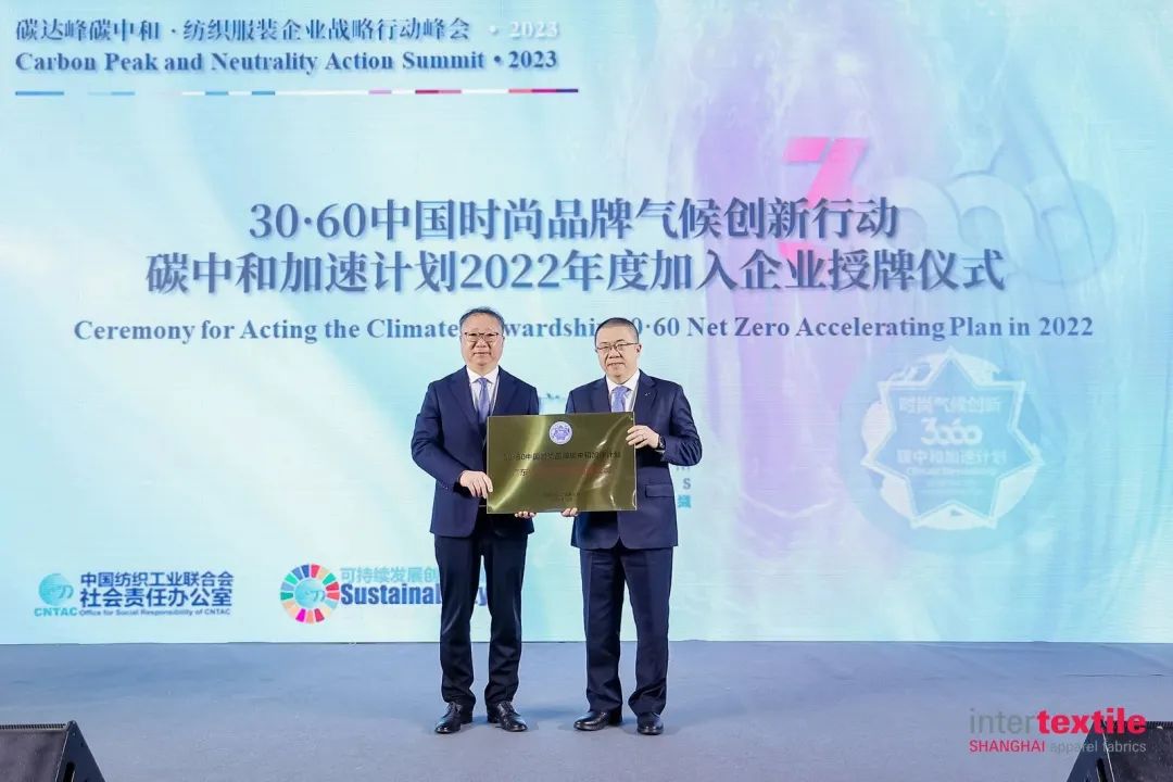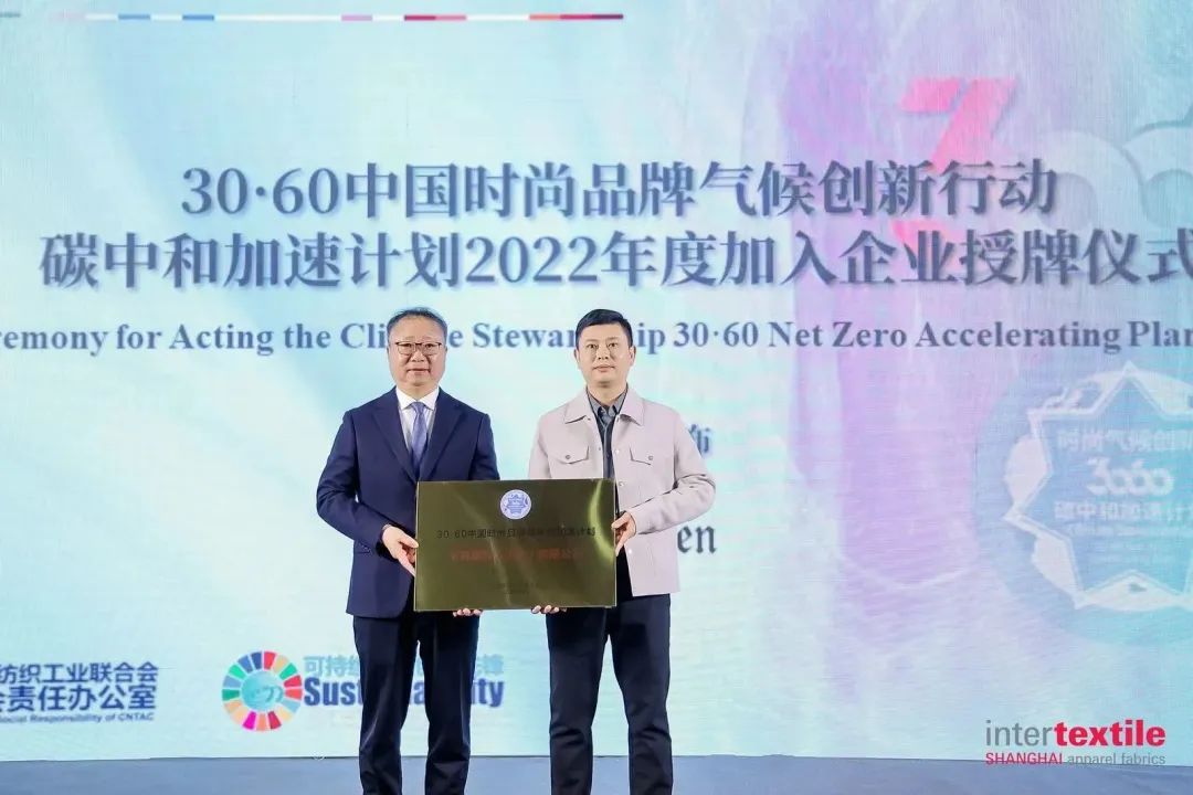 會(huì)上舉行了30·60中國時(shí)尚品牌氣候創(chuàng)新行動(dòng)碳中和加速計(jì)劃2022年度加入企業(yè)授牌儀式。孫瑞哲為鄂爾多斯、卡賓服飾、達(dá)利中國、廣東兆天的企業(yè)代表頒發(fā)牌匾。