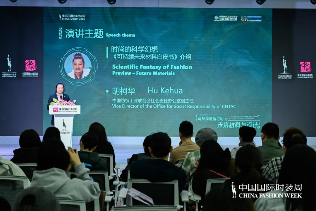 在論壇上,中國紡織工業聯合會社會責任辦公室副主任胡柯華重點解讀了《時尚的科學幻想:可持續未來材料》預覽版報告。該報告由中國紡織工業聯合會發起,歷經三年打磨,于2024年3月在上海發布。值此中國國際時裝周之際,胡主任特別向與會者介紹了該報告的主要內容和愿景。胡主任指出:“時尚和科學離得最近的就是材料。未來我們的行業應該如何發展,以滿足人們對時尚的追求,同時又要具備可持續性呢?”報告項目在過去三年里集結了廠商、品牌、大學等機構,成立了虛擬實驗室,旨在讓行業和公眾了解未來材料的發展方向。