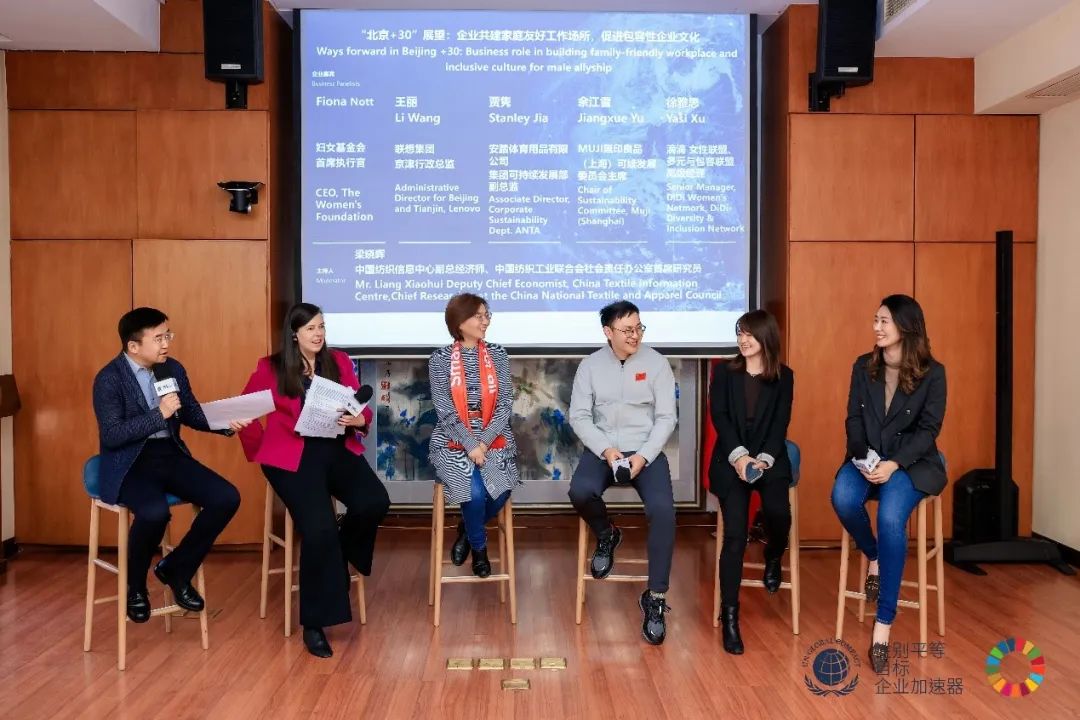 在 [展望“北京+30”:企業共建家庭友好工作場所,促進包容性企業文化]企業圓桌論壇中,梁曉暉博士擔任主持人,與來自安踏、滴滴、聯想、無印良品和婦女基金會的代表共同討論建設家庭友好企業的成果和挑戰。